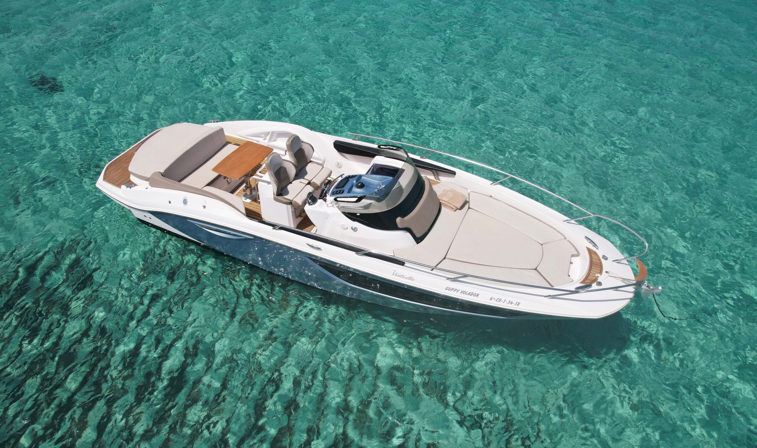 Cruise Ibiza’s stunning coastline aboard Key Largo 27—a sleek, sporty yacht perfect for beach-hopping, swimming, and soaking up Mediterranean sun in style.